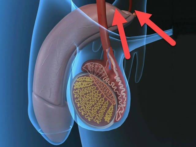 El pene aumenta de tamaño durante la erección debido a que se llena de sangre. Para ello, 2 grandes vasos sanguíneos (flechas en la imagen) se aproximan al pene.